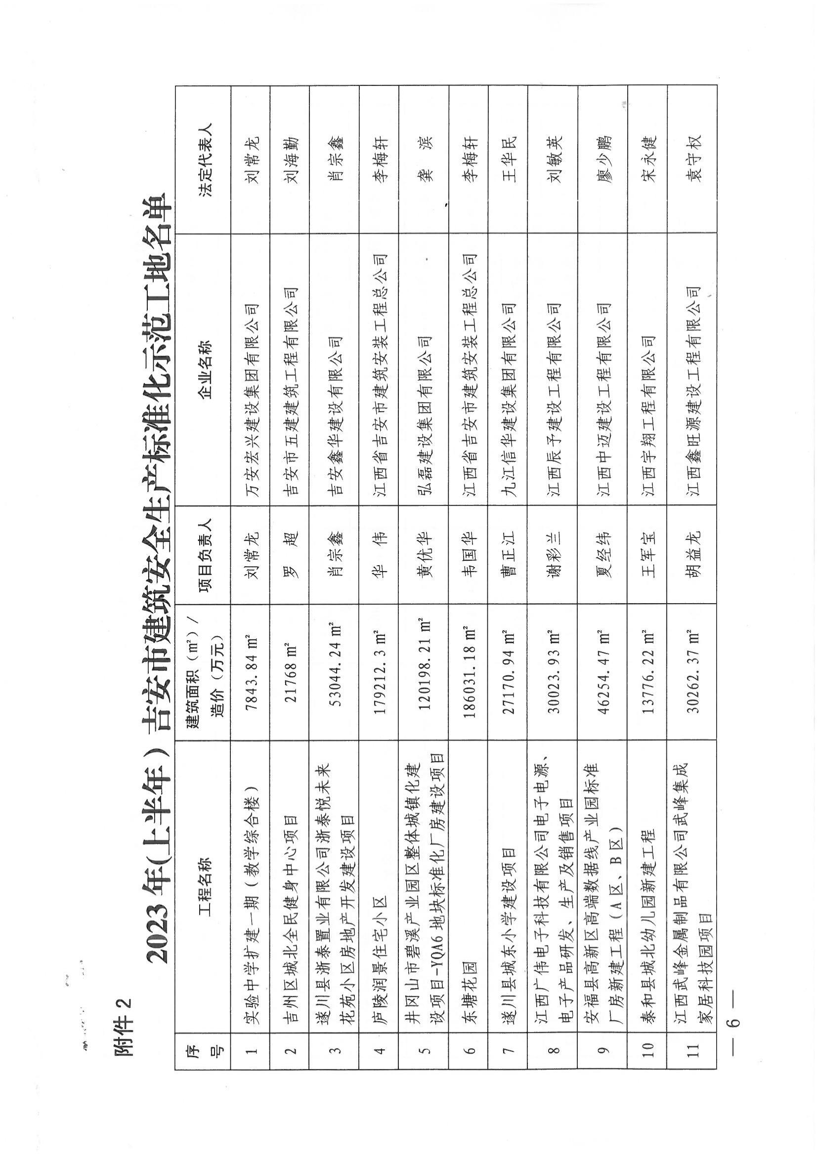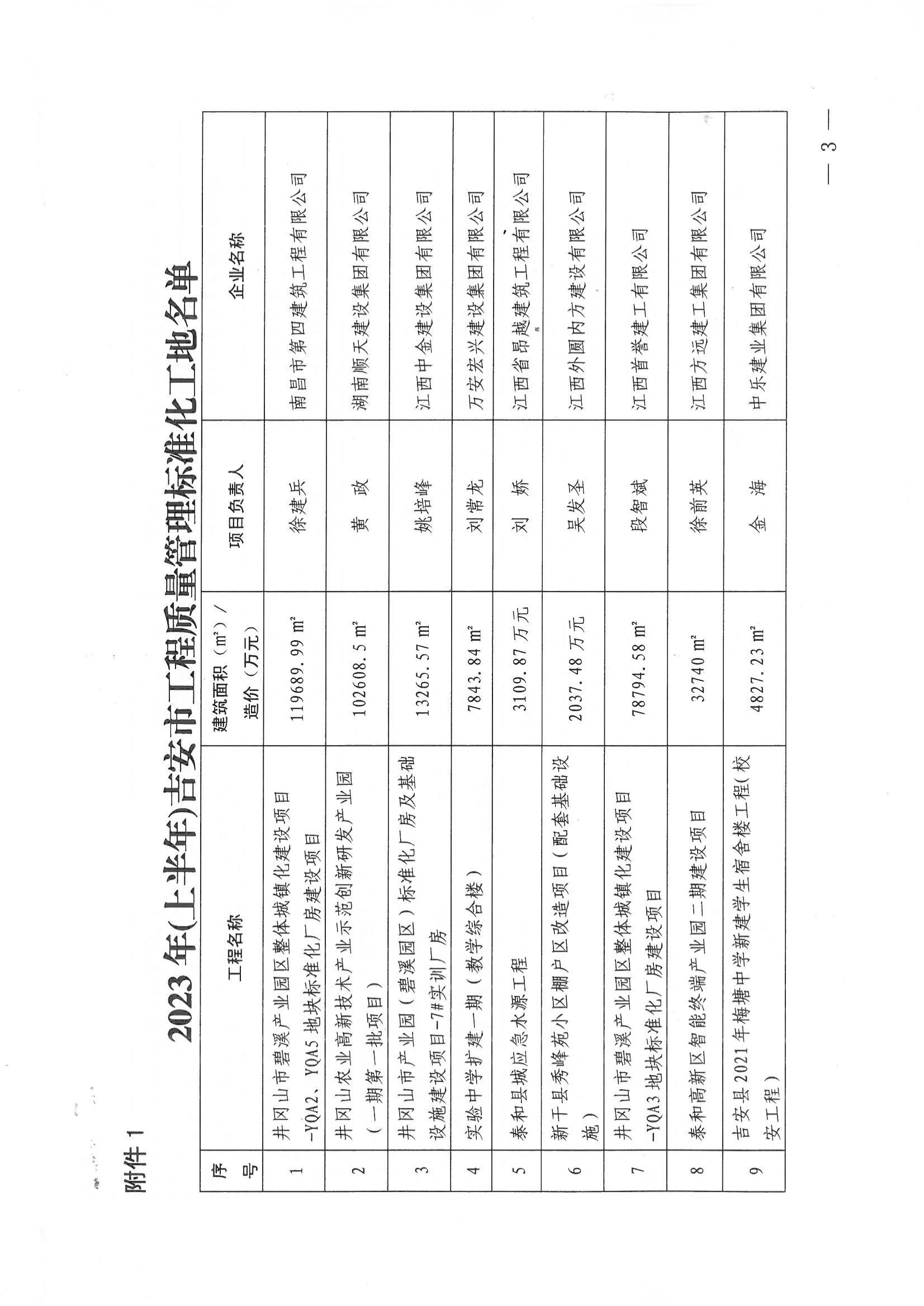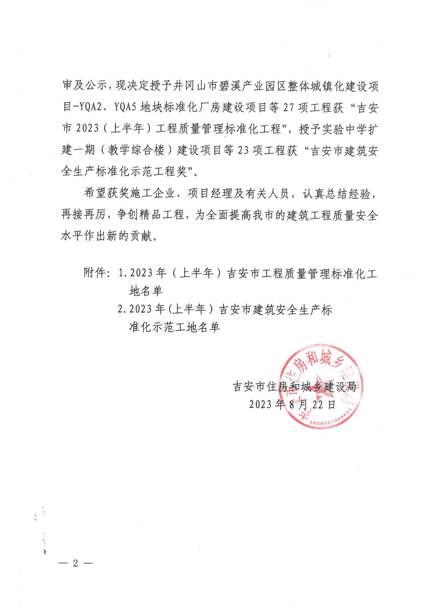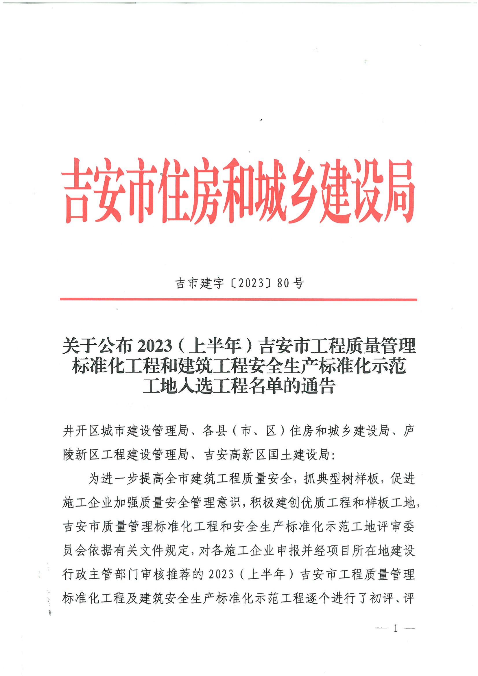 關(guān)于公布2023(上半年)吉安市工程質(zhì)量管理標(biāo)準(zhǔn)化工程和建筑工程安全生產(chǎn)標(biāo)準(zhǔn)化示范工地入選工程名單的通告