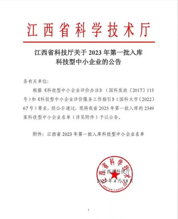 2023年榮獲江西省科技型中小企業(yè)
